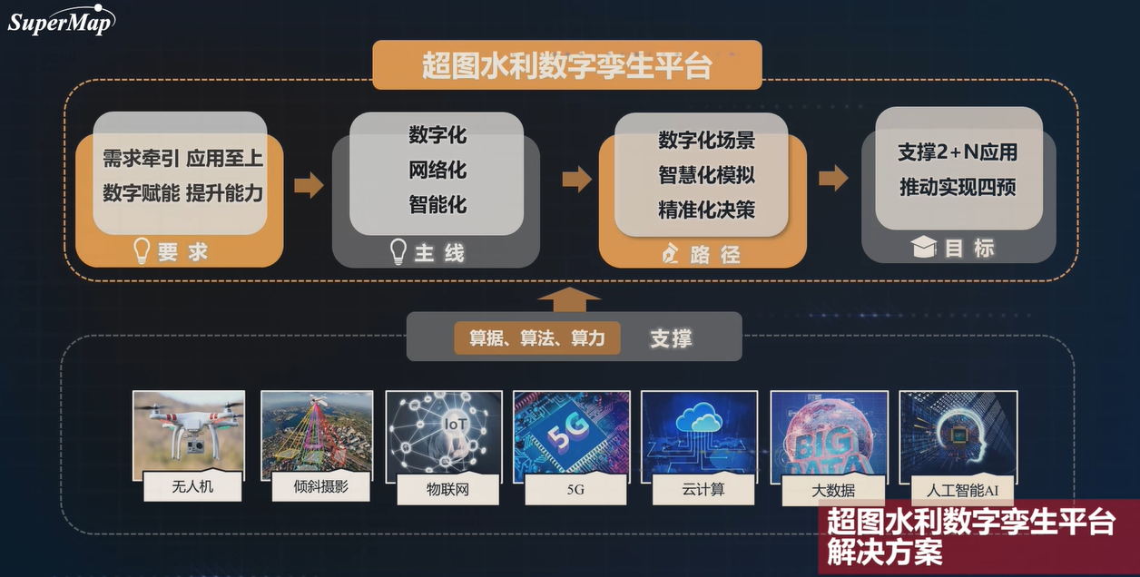 超图水利数字孪生平台基于安全可靠的全国产软硬件环境,依托跨平台GIS、新一代三维GIS、大数据GIS、人工智能技术等,以物理实体(流域/工程/灌区等)为单元,以时空数据为底座,以AI+水利模型与知识为驱动,构建多维多尺度数据底板、二三维一体化数字场景、数算一体模型管理平台、水利时空知识平台、水利智能体,实现对物理流域全要素和水利治理管理活动全过程的数字映射、智能模拟和前瞻预演,全面赋能“2+N”水利智能业务应用。