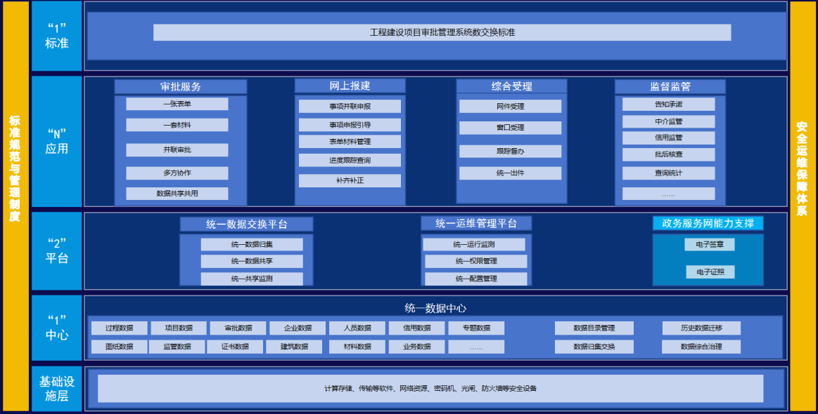 系统采用五层标准化架构设计,以《工程建设项目审批管理系统数交换标准》为核心规范,以"标准化驱动、数据共享、业务协同"为核心理念, 集成"审批服务、综合受理、监督管理、网上报建"四大功能模块,覆盖"一窗受理、并联审批、联合验收、信用监管"等全流程业务,构建全方位、全流程数字化管理体系,助力工程审批提质增效。