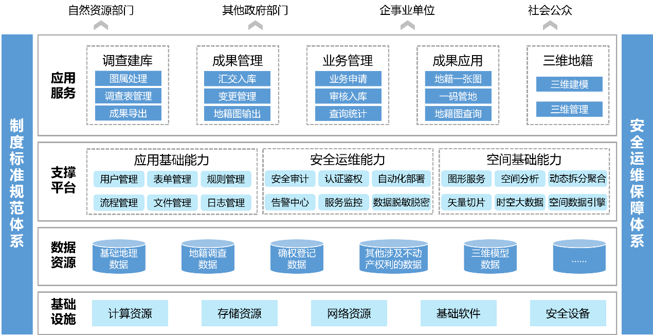 以计算资源、存储资源、网络资源等基础设施为基石,深度汇聚融合基础地理数据、地籍调查数据、确权登记数据、不动产权利相关数据及三维模型数据,构建地籍数据库。依托应用基础、安全运维、空间基础等核心能力,聚焦自然资源部门、其他政府部门、企事业单位及社会公众等多元用户需求,打造新时代地籍管理系统,包括调查建库、成果管理、业务管理、成果应用等子系统及三维地籍扩展模块,覆盖“地籍调查建库-数据质量检查-数据动态更新-数据统一管理-成果共享应用”等关键环节,为地籍调查全流程提供坚实有力的信息化支撑,构建地籍调查规范化管理新模式,驱动地籍管理模式变革、方式重塑、应用创新,为自然资源管理现代化注入强劲动力。