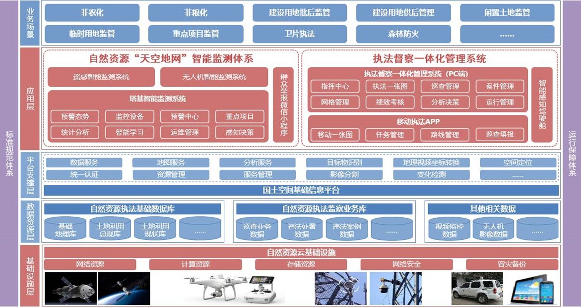 执法督察解决方案主要包括“天空地网”智能监测体系和执法督察一体化监管系统两部分。