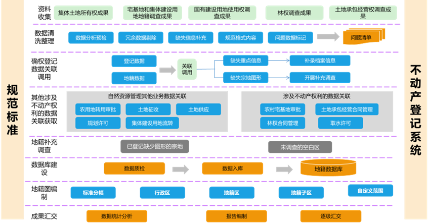 全面收集整理宅基地、建设用地等地籍调查成果,清洗数据,按类形成问题清单。关联登记与地籍调查数据,补充缺失信息和图形。收集自然资源管理及不动产权利相关业务数据,整理后编制不动产单元代码并关联入库。对缺失图形的宗地及地籍空白区开展补充调查,建设地籍数据库,实现一体化管理,按规范生成地籍图并汇交成果。通过地籍图编制全流程作业,夯实完善地籍数据,建立健全地籍数据库。