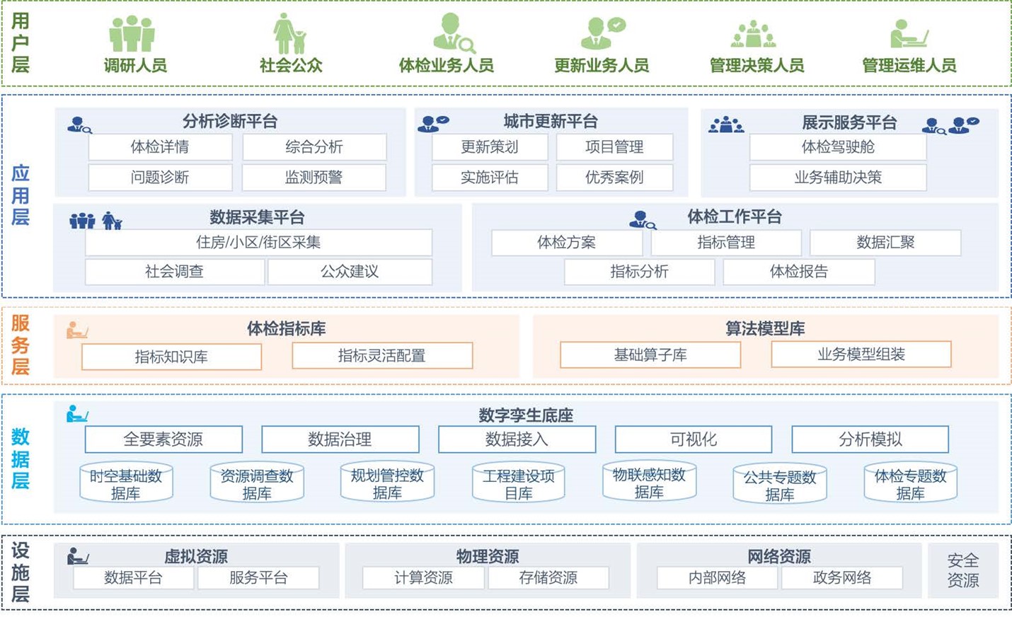 2022年住建部发布《城市体检评估管理信息平台建设指南》(试行)明确了国家级、省级、市级体检平台建设总体架构级平台功能。