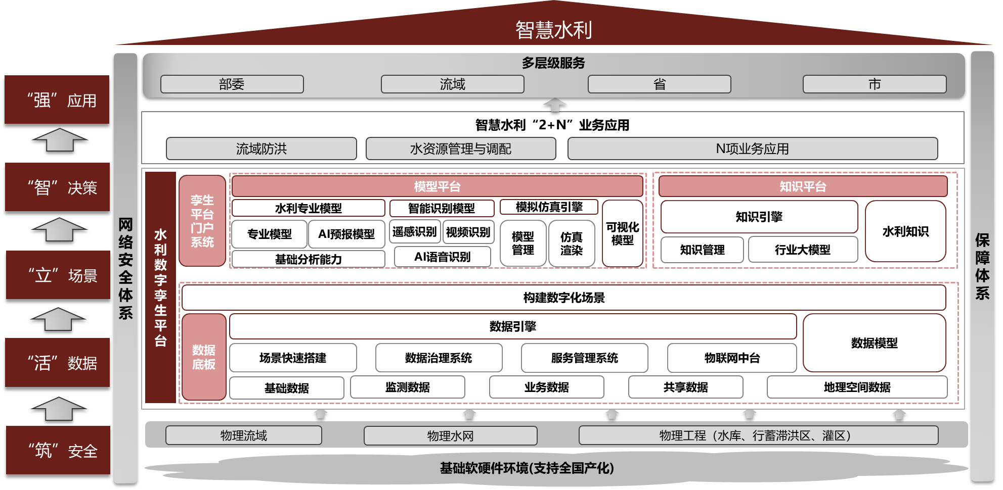 以水利专业模型、智能模型、水利知识为驱动,利用AI技术推动数智化升维,提升面向2+N业务应用的模拟仿真推演能力和智能分析决策能力,实现水利管理活动智慧赋能。